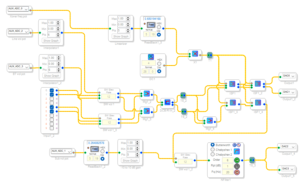 - Adjustable subwoofer crossover filter in the ISF blocks. There are four preset filter configurations and a rotary switch to select preset (the image shows a potmeter I used initially). The preset positions are 24 dB/octave Linkwitz–Riley filters at 80, 100 (for the EVU-1062/95), or 150 Hz (for some very tiny speakers I have), and a full range mode. I don't like continously adjustable crossovers as it is too easy to adjust them by accident and don't be able to get back to the exact same position.