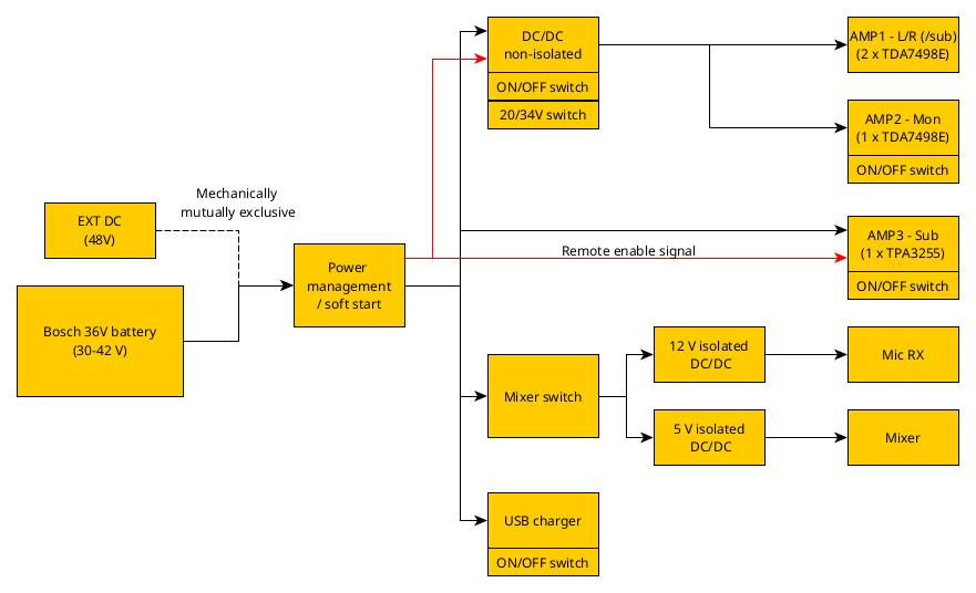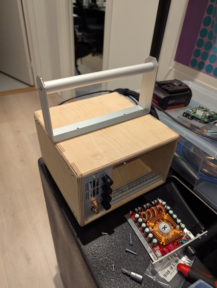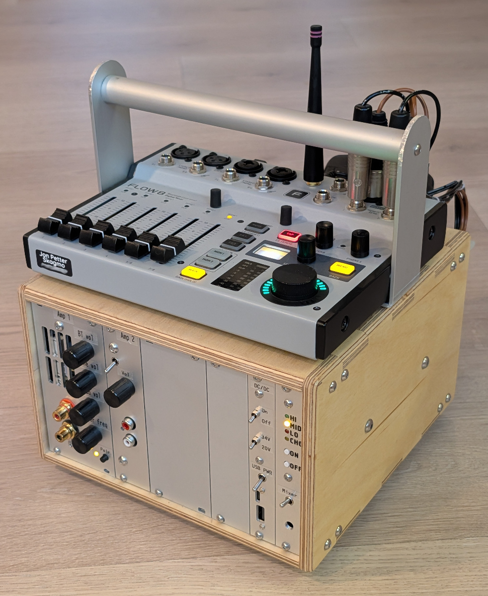 The left image below shows the all-in-one unit with amplifiers, DC/DC-regulators, power management and mixer. The right image shows the complete system. There are two different size subwoofers, allowing me to mix-and-match depending on how much weight/volume I want to carry.