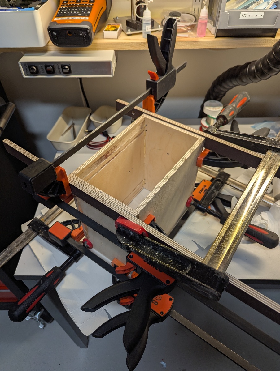 - The corner radius in the box joints from the router bit needed to be removed with a file before gluing with PU glue