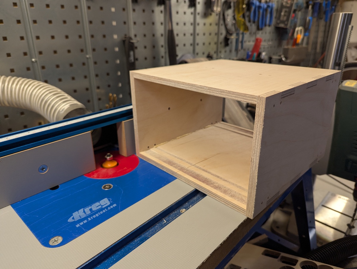 - I used a flush trim bit to make the box joint flush with the sides, then a roundover bit on all edges.