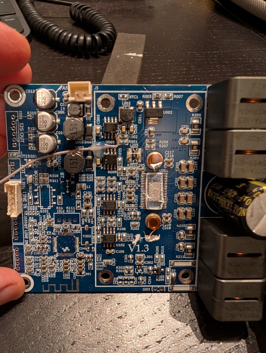 Normal idle current is 180 mA at 48 V (8.3 W), but can be easily reduced to ~1 mA (~0.05 W). There are two XL7005A buck regulators on the board. U001 is set to 15 V, and is regulated down to 12 V with an LDO to provide the VDD/GVDD voltage for the TPA3255. U003 is set to 5 V and used, among other stuff, for the DSP chip which is not provided on the -A version of the board. By pulling the !ENABLE pin on U001 high (abs. max 7 V, so I use the 5V output from U003 for this), the VDD and GVDD rails for the TPA3255 is powered down, reducing current to 1 mA!
