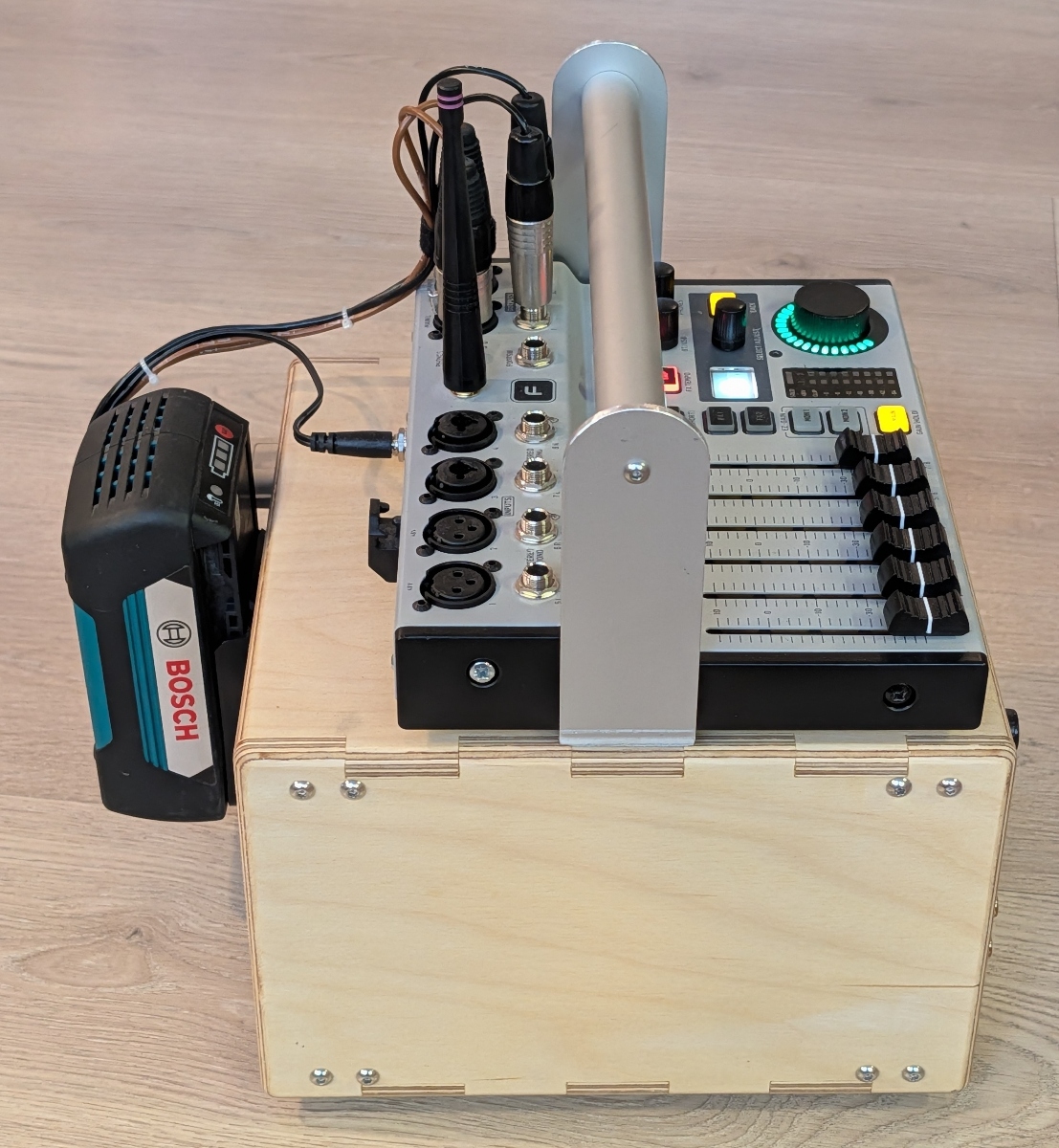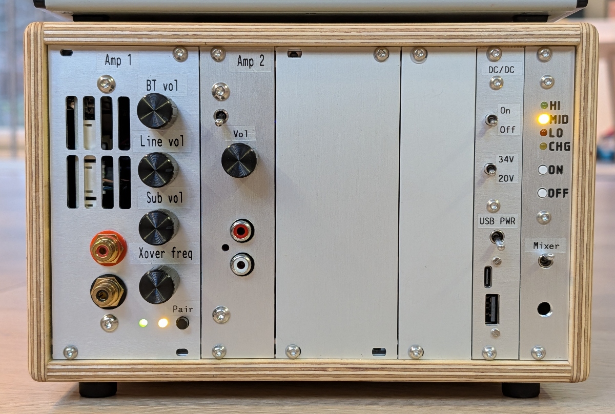 - Volume pots for internal bluetooth receiver and line input (connected to console/mixer)