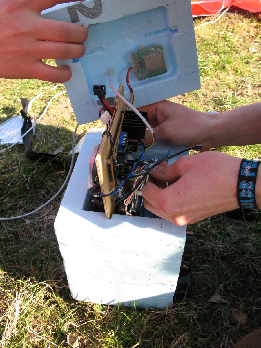 Primary downlink: 600mW, 2.41GHz, PAL, video and sound. The video channel toggles between the secondary and primary camera with 10 second intervals. The sound channel transmits continuous 300 baud APRS packets including temperature, battery voltage, position and altitude.