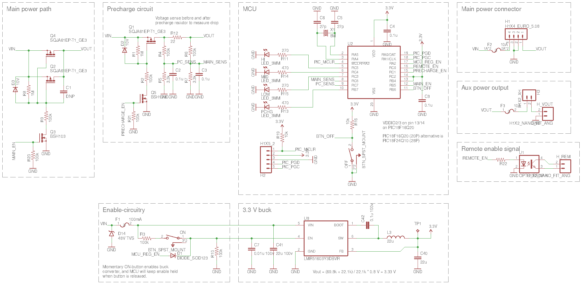 - Remote control signal: There's an optoisolated output signal that turns on the main DC/DC converter and the amplifiers only after precharge is complete, to prevent additional current consumption from interfering with the precharge phase and heat the precharge resistor unnecessarily.