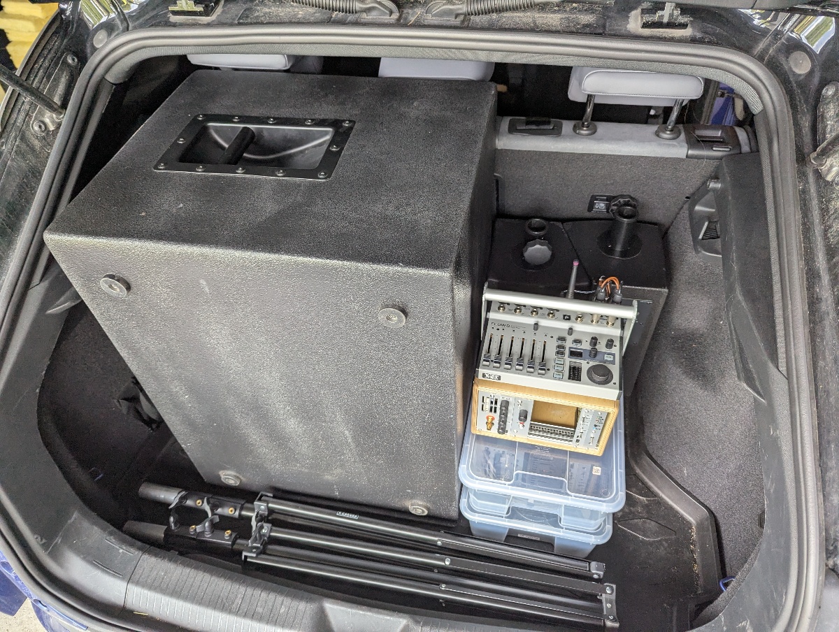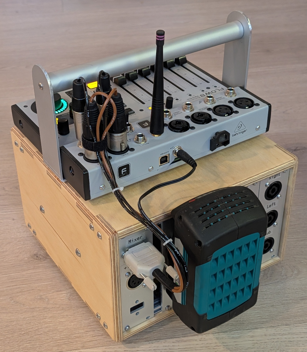 The left image below shows the all-in-one unit with amplifiers, DC/DC-regulators, power management and mixer. The right image shows the complete system. There are two different size subwoofers, allowing me to mix-and-match depending on how much weight/volume I want to carry.
