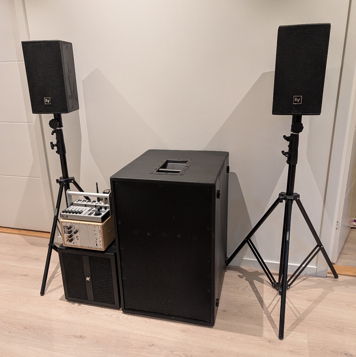 - 2 x EVU-1062/95: Really good speakers, can't recommend these enough. Very linear and transparent sound. Small and light, with 6,5" woofer. To get a high SPL from such small speakers, EV chose to design these speakers so they can't really play anything below 100 Hz. But if you give it a steep 24 dB/octave high pass filter at 100 Hz it plays very loud before distorting. It uses the same 1,3" compression driver and constant directivity horn as the other much larger speakers in the EVU series, so the tweeter can take a lot of abuse. Got these used for a good price.