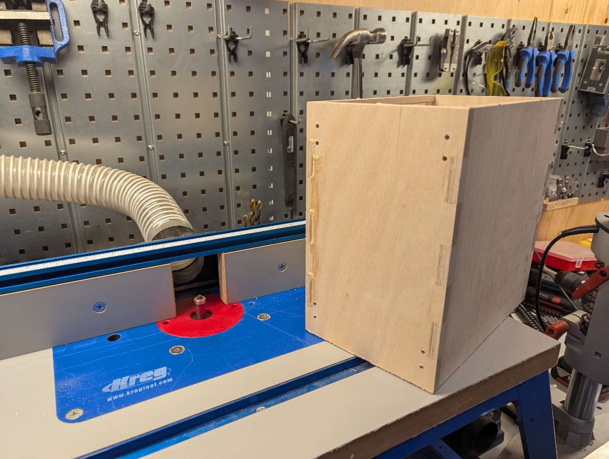 - I used a flush trim bit to make the box joint flush with the sides, then a roundover bit on all edges.