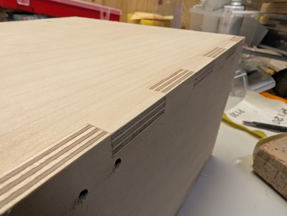 - The corner radius in the box joints from the router bit needed to be removed with a file before gluing with PU glue