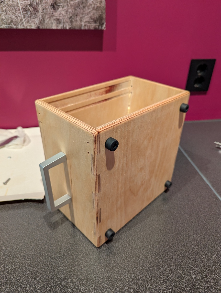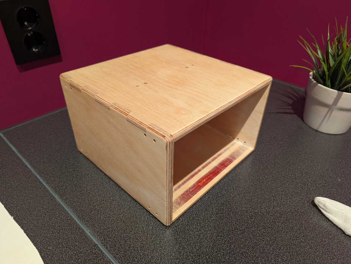 - Finally I treated the cabinet with some oil. I considered Warnex or similar structured paint for the black "PA look", but I didn't want to hide the nice box joints.