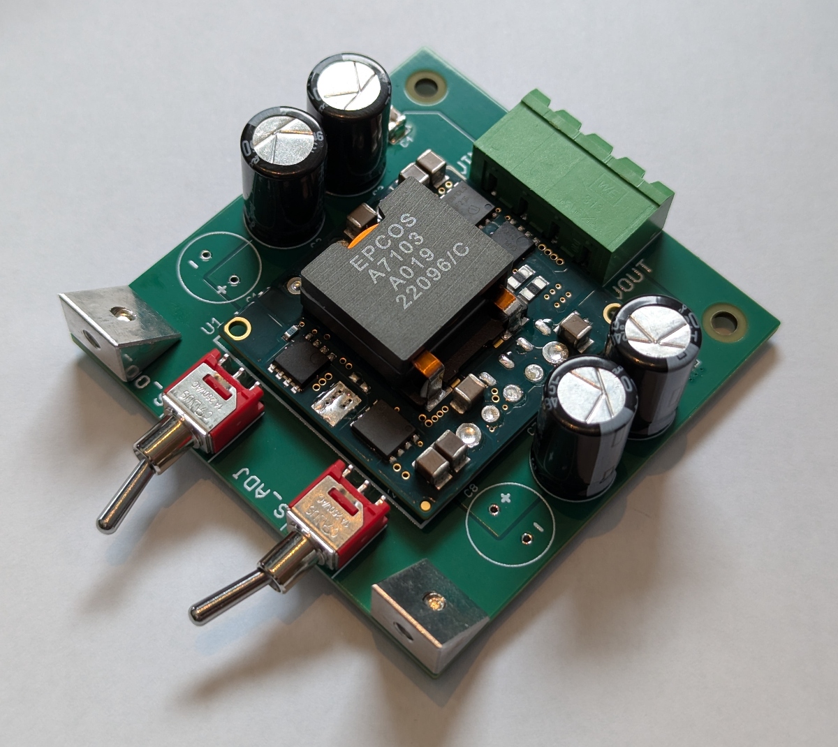 - Inrush current limiting: With three amplifiers and three DC/DC converters, there's a lot of capacitance in the system. The sparks generated when powering on this system with 48 V proved that I should use something else than a mechanical switch. The soft start circuit charges the system with a 10 Ω series resistor until the voltage across the precharge resistor is below 1 V, then a 9 mΩ 60 V MOSFET turns on the output. The "CHG" LED lights up during precharge and will blink if the precharge fails / times out.