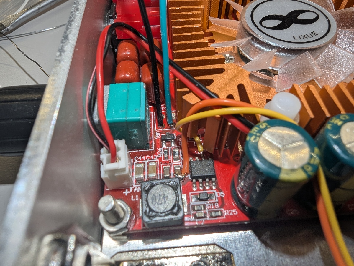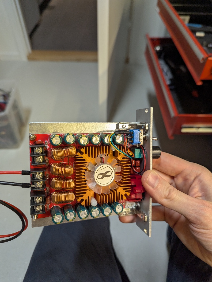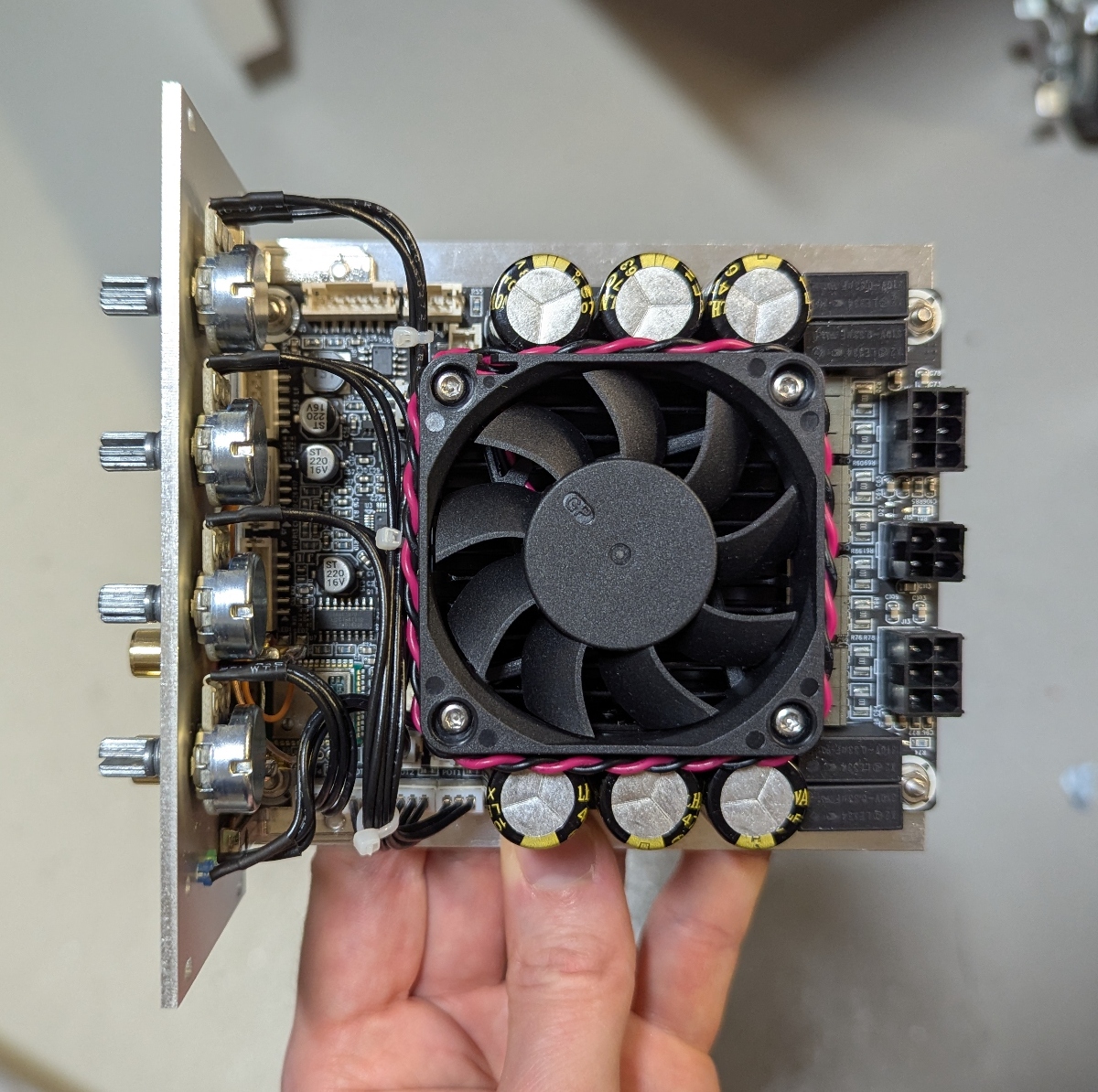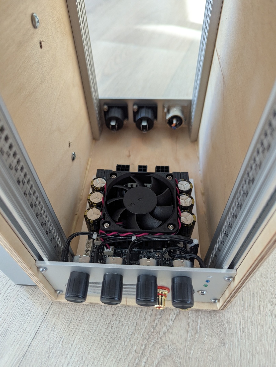 The third amplifier is a Wondom BDM8-A, based on a TPA3255. It is cheap, but has quite good components, especially the inductors. This is used when higher power is needed for the subwoofers.
